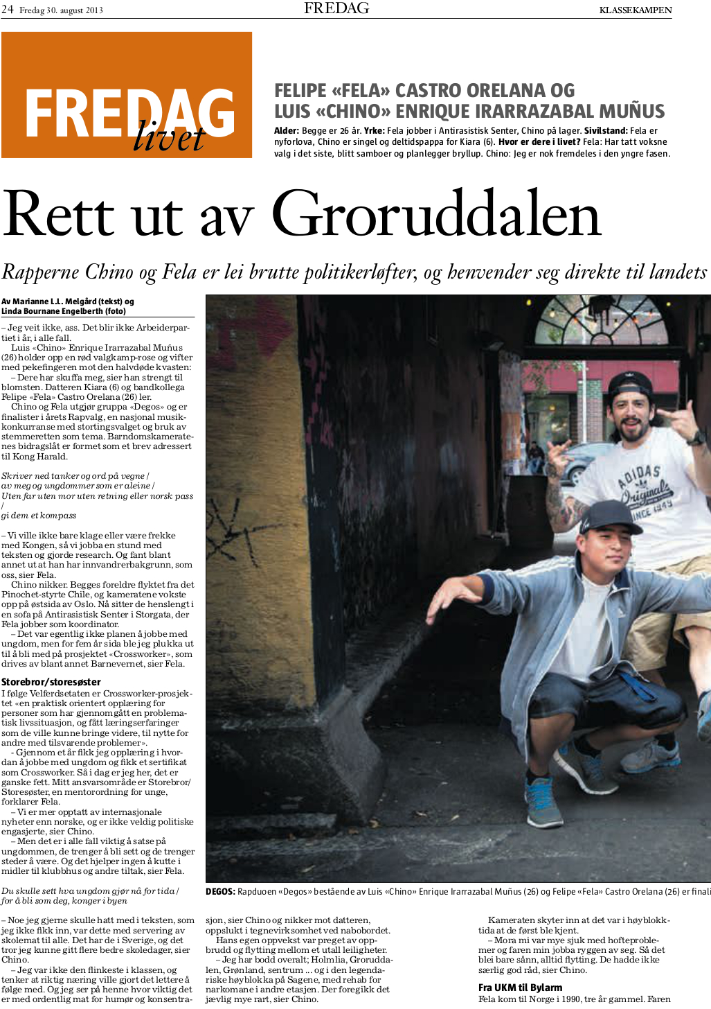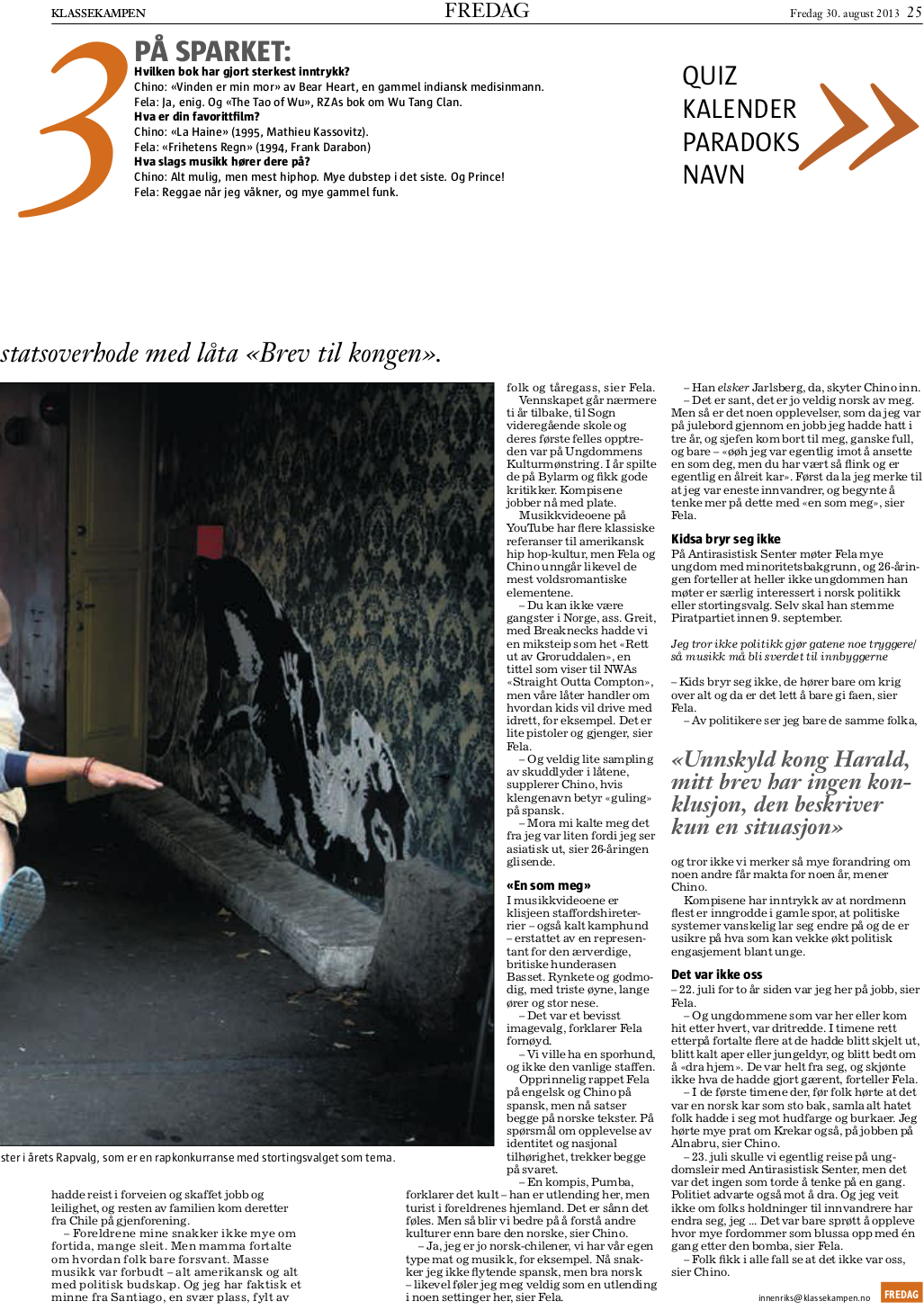 – Vi ville ikke bare klage eller være frekke med Kongen, så vi gjorde en del research, sier rapperne Fela og Chino (Som dagen etter artikkelen ble trykket vant det nevnte Rapvalg 2013 som «Degos»).