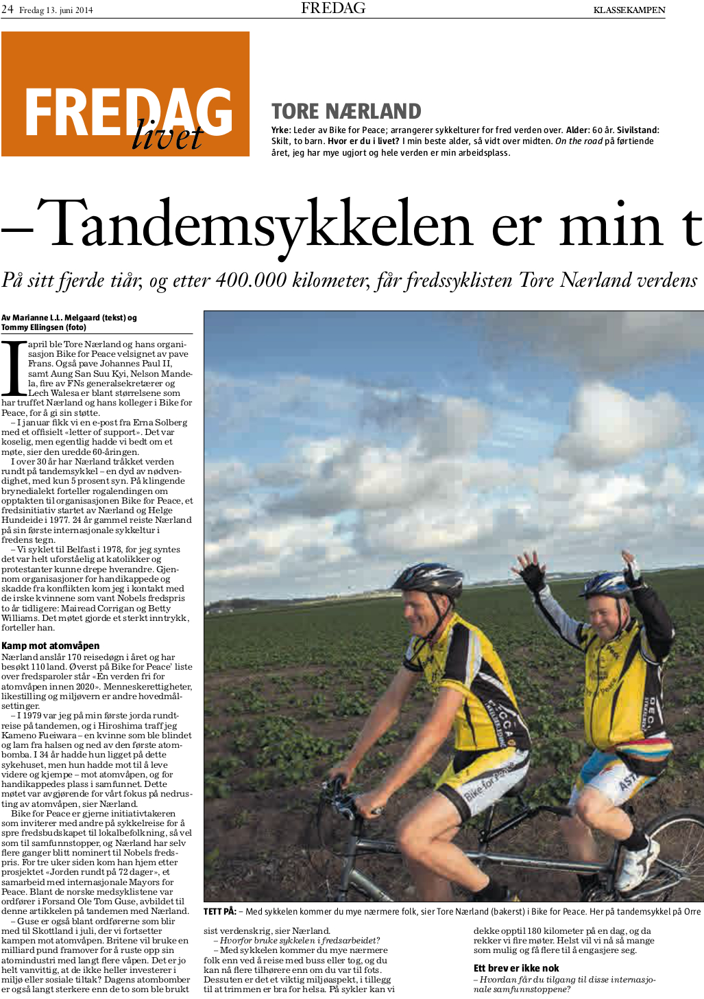 På sitt fjerde tiår, og etter 400.000 kilometer, får fredssyklisten Tore Nærland verdenstoppene til å lytte. – Jeg er nok voldsomt uredd, sier rogalendingen.