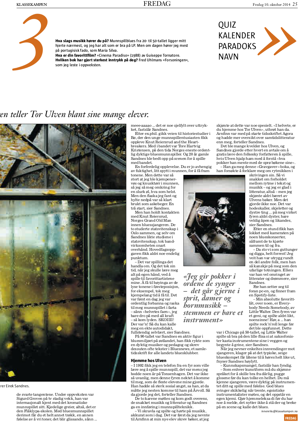 – Munnspillingen fenget mer enn statsvitenskap, forteller Eirek Sandnes. Bluesmusikeren teller poeten Tor Ulven blant sine mange elever.