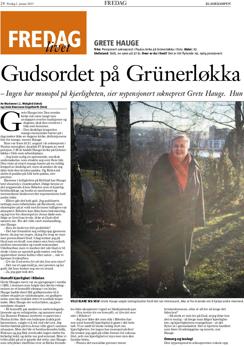 – Ingen har monopol på kjærligheten, sier nypensjonert sogneprest Grete Hauge. Hun var den første norske presten som velsignet et homofilt ektepar i kirken.