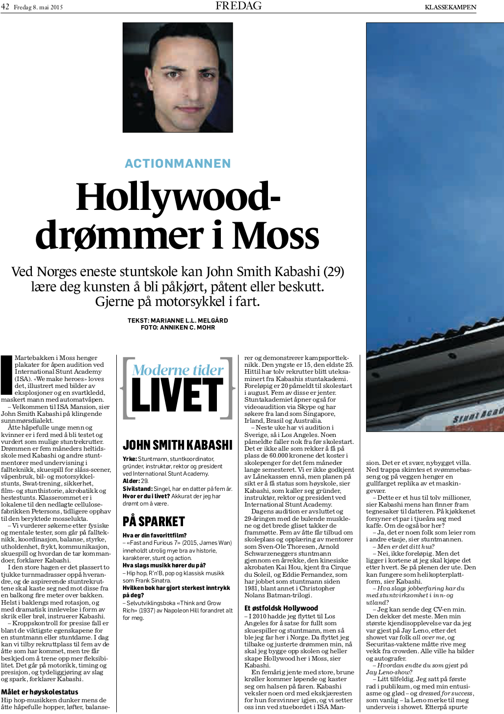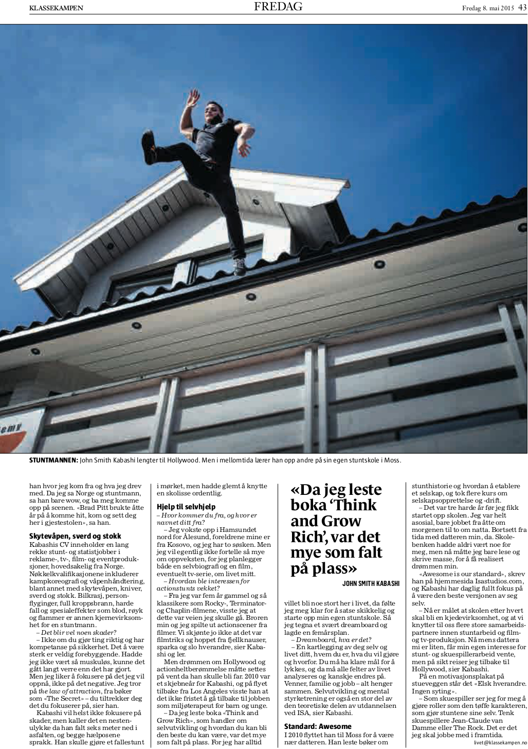 Ved Norges eneste stuntskole kan John Smith Kabashi lære deg kunsten å bli påkjørt, påtent eller beskutt. Gjerne på motorsykkel i fart.