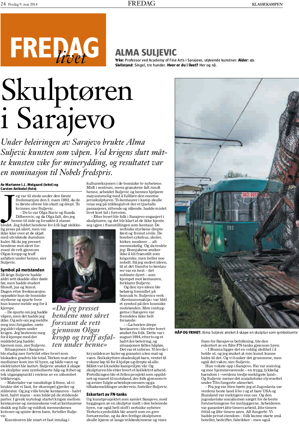 Under beleiringen av Sarajevo brukte Alma Suljevic skulpturkunsten som våpen. Ved krigens slutt var fokuset på minerydding og aktivisme gjennom performance, og professoren ble nominert til Nobels fredspris.